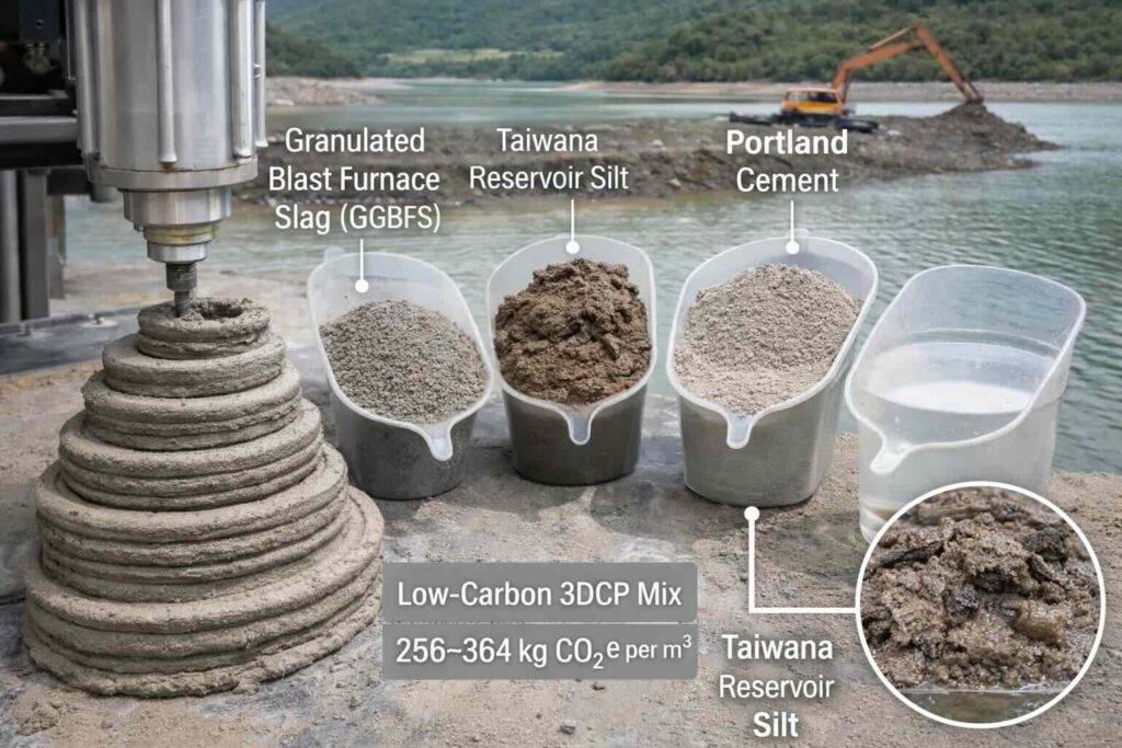 Il punto di partenza del caso raccontato da Fabbaloo (10 febbraio 2026) è un utility model di Taiwan identificato come TWM676956U, che propone una miscela per 3DCP in cui una quota di materiali “vergini” viene sostituita con limo/sedimento di bacino (reservoir silt) opportunamente trattato, mantenendo le prestazioni richieste dalla deposizione a strati e cercando l’allineamento con criteri locali di “green concrete”.