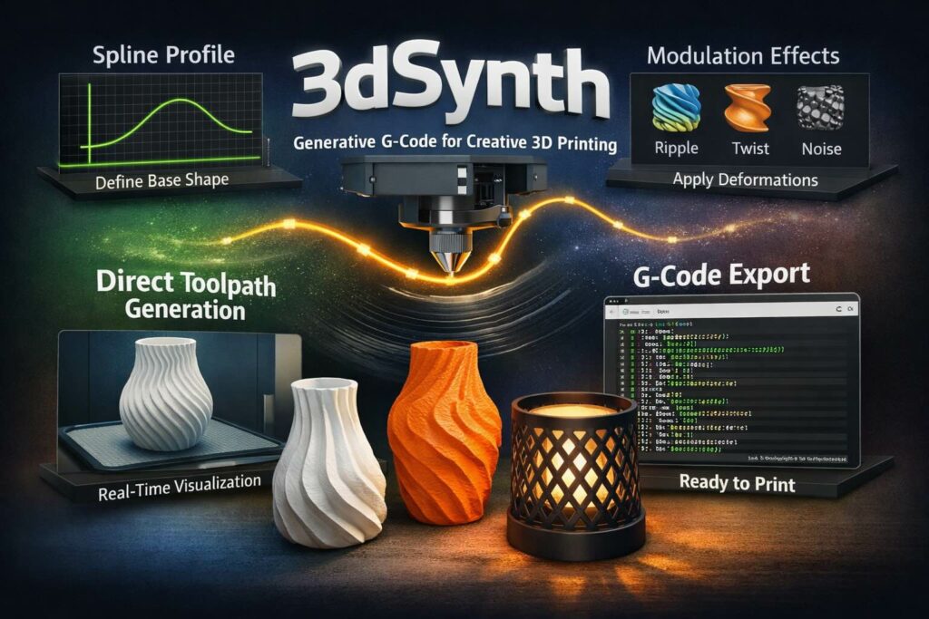 3dSynth è una piattaforma software orientata alla stampa 3D desktop a estrusione (FDM/FFF) che propone un flusso di lavoro diverso rispetto alla pipeline tradizionale “modello CAD → STL → slicer → G-code”. Invece di partire da una mesh (tipicamente STL/OBJ) e demandare allo slicer la generazione dei percorsi utensile, 3dSynth calcola direttamente i toolpath e li esporta come G-code pronto macchina, costruendo forme attraverso parametri matematici ed effetti generativi. L’idea è spostare il controllo dal “solido/poligoni” al “movimento dell’estrusore”, rendendo più immediata la creazione di oggetti decorativi e scultorei (vasi, paralumi, superfici testurizzate) in cui l’aspetto finale dipende in modo forte dal percorso e dalla continuità dell’estrusione.