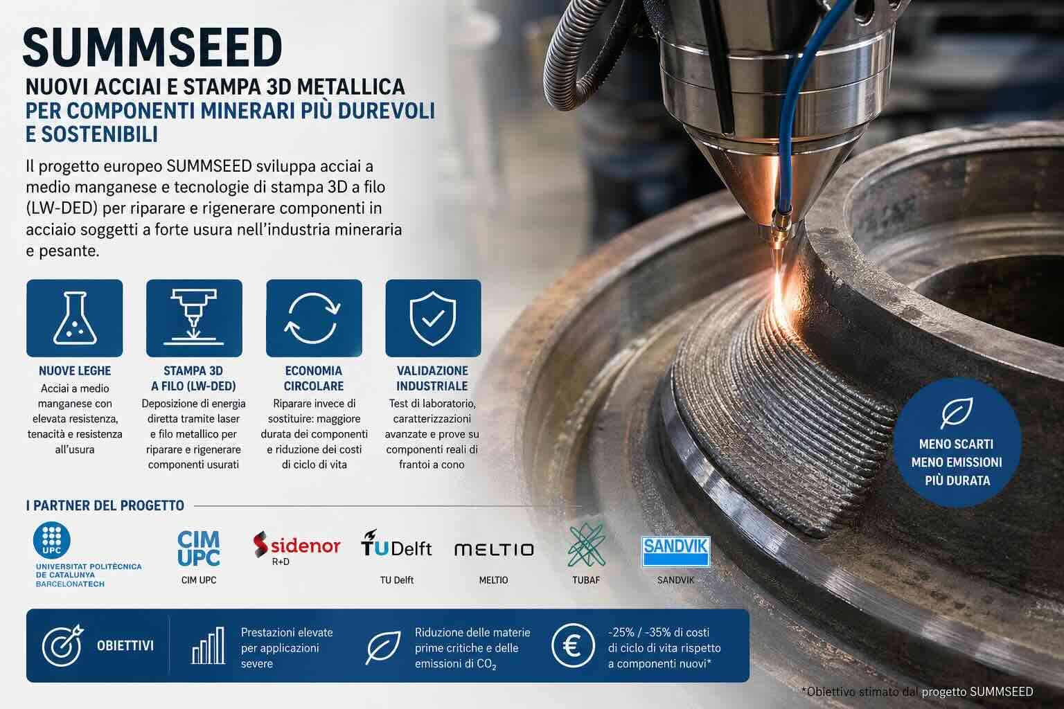 SUMMSEED prova a costruire un percorso diverso: usare nuovi acciai a medio manganese e tecniche DED per rigenerare componenti usurati. L’obiettivo è mantenere in servizio più a lungo parti ad alto valore, ridurre gli scarti metallici e limitare la necessità di produrre ogni volta un componente nuovo. Il sito ufficiale del progetto parla di una catena circolare che va dalla fusione alla riparazione con DED, con l’obiettivo di allungare la vita dei componenti e contenere lo spreco di materiale.