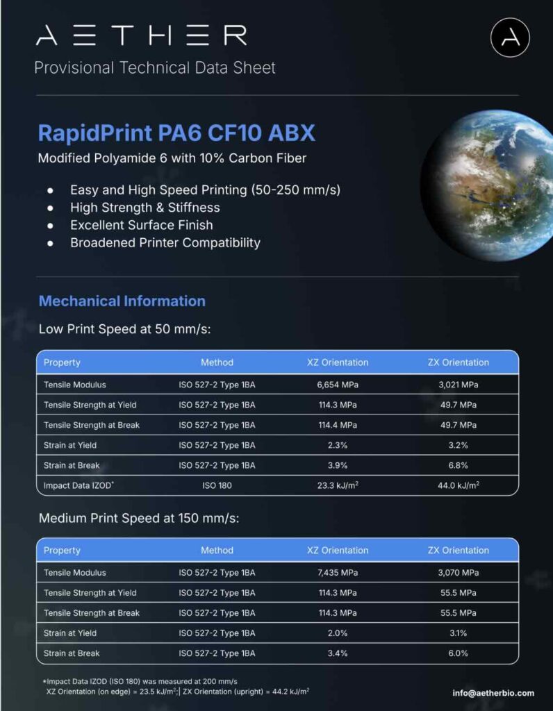 Il primo prodotto commerciale della linea è RapidPrint PA6 CF10 ABX, un PA6 (poliammide 6) rinforzato con il 10% di fibra di carbonio. Secondo Aether, il materiale è progettato per alto flusso (high flow), buona finitura superficiale e ampia compatibilità con le stampanti FFF/FDM, con un range di velocità consigliato tra 50 e 250 mm/s. In pratica, mira a offrire la rigidità e la stabilità termica tipiche di un nylon caricato fibra di carbonio, ma con parametri di estrusione che si avvicinano a quelli dei filamenti “rapidi” più recenti.