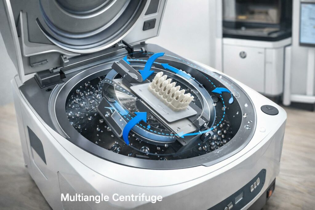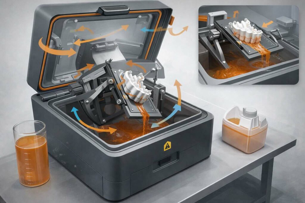 Nelle pratiche più comuni, la rimozione della resina avviene tramite immersione in solvente e agitazione, scegliendo tempi e sostanze in base al materiale. L’approccio della centrifuga multiangolo mira a ridurre i limiti più tipici: variabilità dovuta a residui in geometrie complesse e aumento del lavoro manuale tra lavaggio, risciacquo, asciugatura e cura UV.