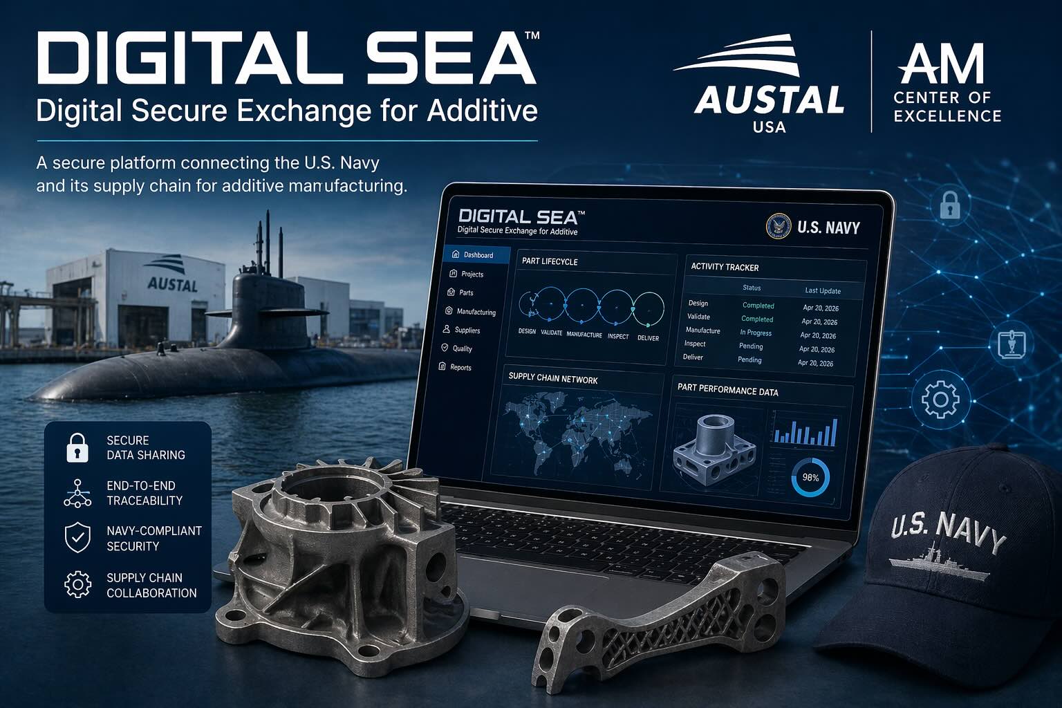 Austal USA ha presentato Digital Secure Exchange for Additive, abbreviato Digital SEA, come piattaforma pensata per consentire alla U.S. Navy e ai fornitori della sua filiera di condividere dati di produzione additiva in modo controllato, con gestione degli accessi e tracciamento dell’evasione delle attività. L’annuncio pubblico è stato riportato il 20 aprile 2026 e si inserisce nel lavoro che Austal USA sta già svolgendo per la base industriale navale statunitense.