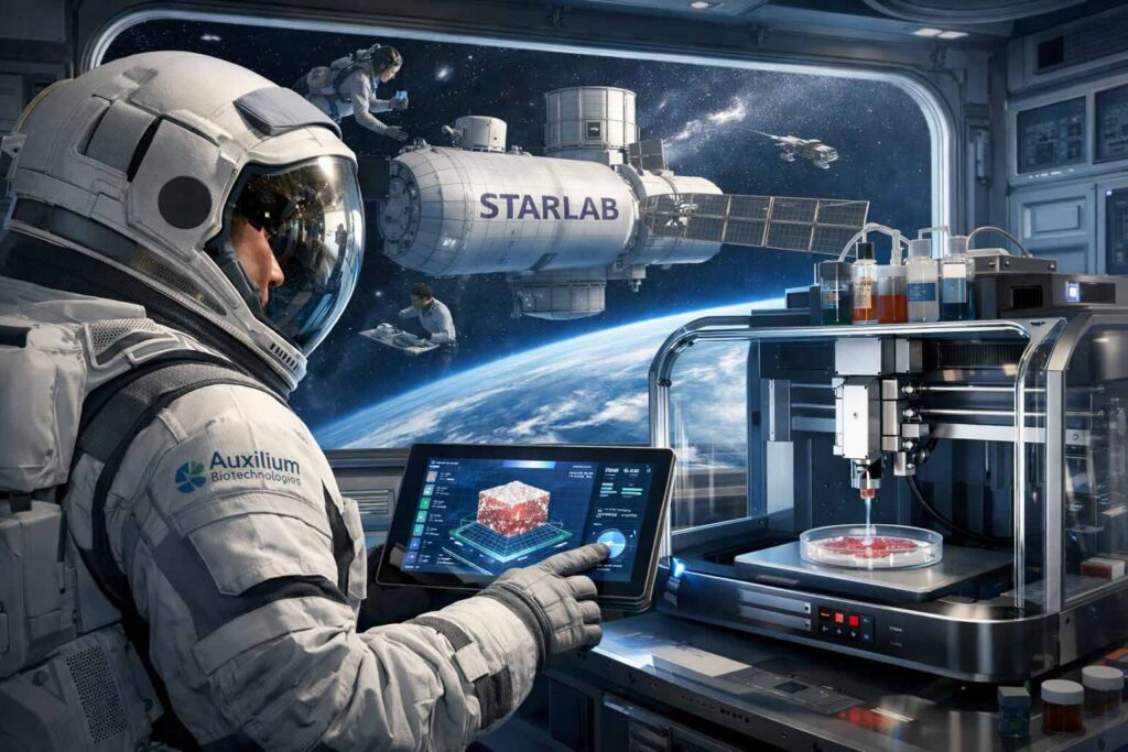 Starlab Space LLC è la joint venture che sta progettando e sviluppando la stazione Starlab: sul fronte industriale e di programma partecipano realtà come Airbus e Voyager Technologies, insieme a partner indicati da Airbus quali Mitsubishi Corporation, Space Application Services, Palantir e MDA. In questo quadro, Auxilium Biotechnologies entra come fornitore/partner per capacità di 3D bioprinting e biofabbricazione in ambiente orbitale, con l’obiettivo dichiarato di abilitare workflow che, a terra, sono limitati dalla gravità quando si parla di strutture cellulari tridimensionali e tessuti delicati.