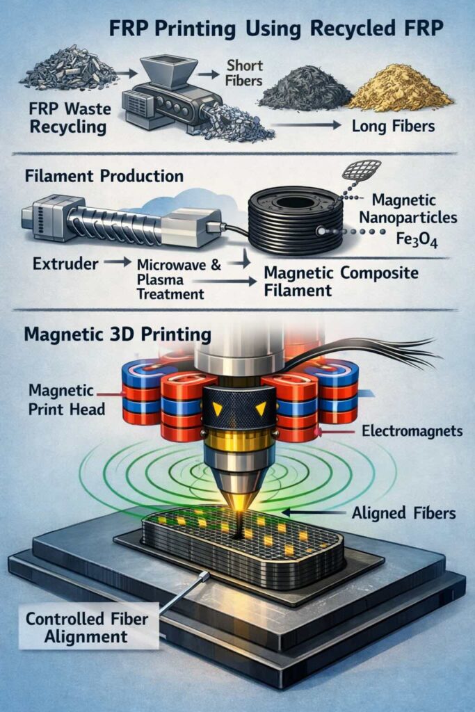 Un articolo di Fabbaloo descrive un brevetto cinese che propone una filiera completa per trasformare rifiuti di FRP (Fiber Reinforced Plastics, plastiche rinforzate con fibra) in un filamento per stampa 3D a estrusione (FFF) capace di orientare le fibre tramite campi magnetici durante la deposizione. La promessa non è “riciclare e basta”, ma ottenere un composito stampato in cui la microstruttura (cioè l’orientamento delle fibre) sia controllata in funzione della zona del pezzo, avvicinando il concetto di rinforzo “su richiesta” a partire da feedstock riciclato.