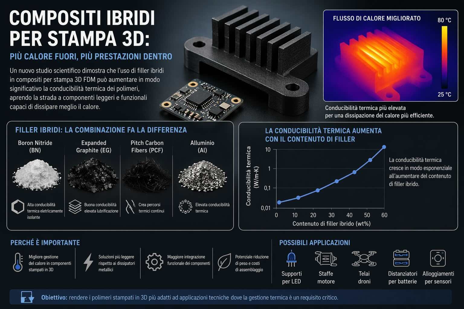 Le review scientifiche più recenti sul tema ricordano che i polimeri hanno in genere una conducibilità termica intrinsecamente bassa, tipicamente nell’ordine di 0,1-0,3 W m−1 K−1, valore insufficiente per molte applicazioni nei dispositivi elettronici e nei sistemi compatti ad alta densità di potenza. È per questo che la ricerca sui compositi termicamente conduttivi è diventata centrale: l’obiettivo è mantenere i vantaggi dei polimeri, come leggerezza, lavorabilità ed isolamento elettrico, migliorando però il trasporto del calore. In questa cornice, il lavoro si inserisce in una linea di sviluppo molto concreta per la manifattura additiva.