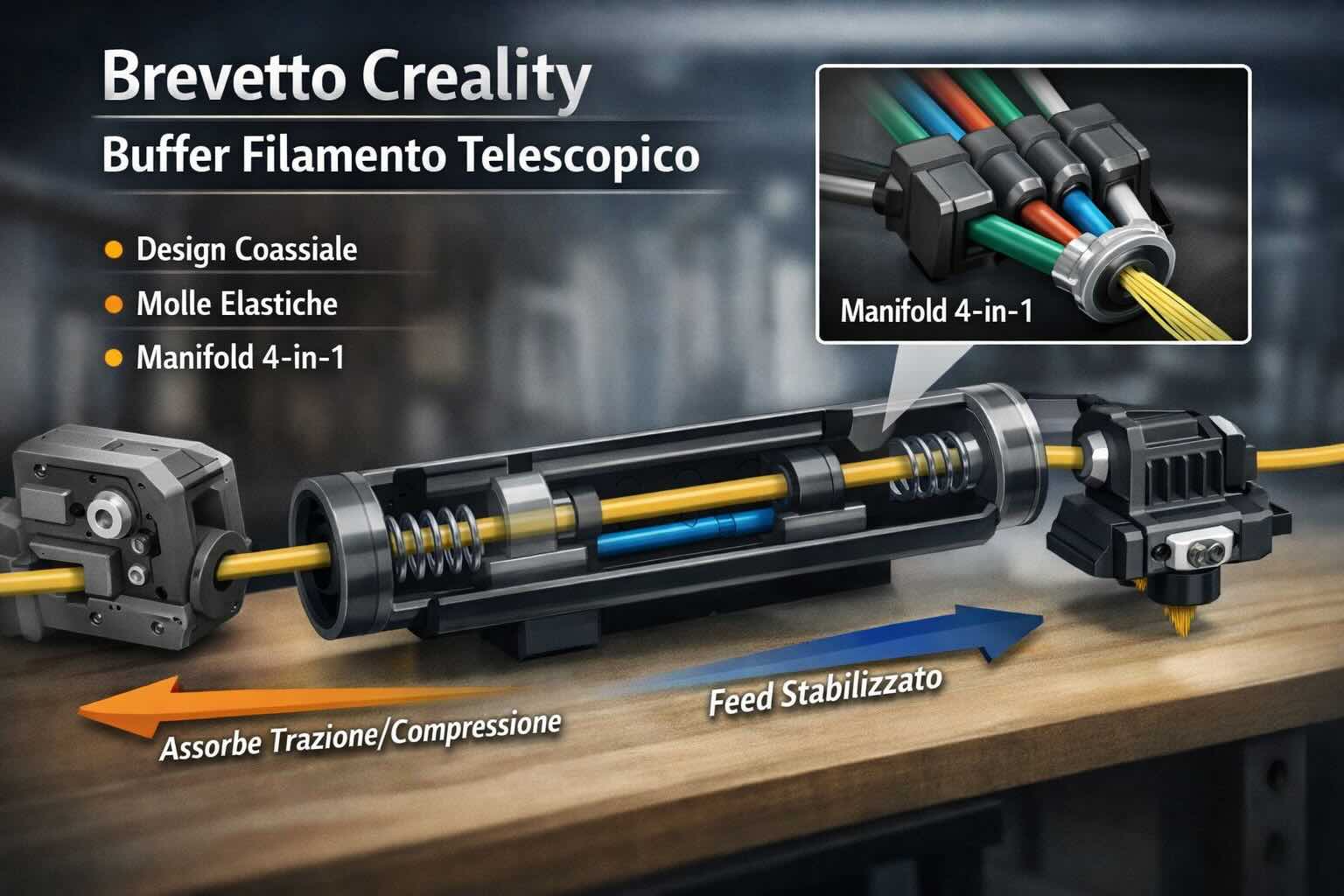Un punto tecnico interessante evidenziato è la compatibilità con più filamenti: il concetto descritto includerebbe anche un manifold di ingresso 4-a-1, cioè un collettore che convoglia più linee in un’unica uscita verso l’estrusore. In ottica di ecosistema, questo può essere letto come una mossa per supportare configurazioni con più sorgenti di alimentazione (o più moduli) mantenendo un tratto finale stabilizzato dal buffer, riducendo errori tipici di retrazione/avanzamento durante il cambio materiale.