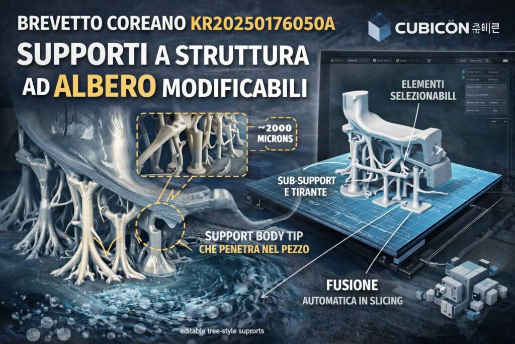 Un brevetto descrive un approccio ai supporti “tree-style” in cui l’utente può selezionare e modificare elementi di supporto generati in un’area definita attorno alla geometria, con l’obiettivo di ridurre il numero di supporti necessari e stabilizzare overhang critici. L’idea chiave è passare da un supporto “unico” generato dallo slicer a una collezione di elementi modificabili a livello di ramo/colonna, che poi vengono “fusi” dal motore di slicing in una struttura ad albero più continua e stabile.