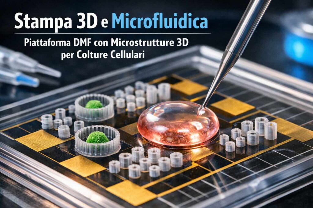 Le cellule nel corpo umano crescono e comunicano in un ambiente tridimensionale; molti test di laboratorio, però, continuano a usare colture 2D su plastiche piane, che possono alterare morfologia, interazioni cellula-cellula e risposta agli stimoli. La microfluidica ha migliorato il controllo di nutrienti, gradienti chimici e condizioni fisiche, ma spesso richiede pompe esterne, flussi continui e processi di fabbricazione complessi (tipicamente litografia e cleanroom). In questo contesto, un gruppo di ricerca della University of Macau propone una strada alternativa: integrare in modo diretto microstrutture 3D stampate sopra gli elettrodi di un chip di digital microfluidics (DMF), così da creare “nicchie” tridimensionali utili alla formazione di sferoidi cellulari, mantenendo la flessibilità della manipolazione a gocce tipica della DMF.