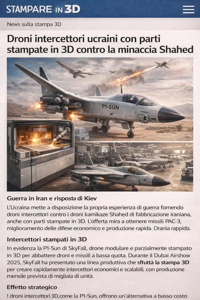 Durante la Dubai Airshow, oltre alla P1‑Sun, SkyFall ha esposto anche altre piattaforme come varianti “Vampire” riconfigurate in droni bombardieri, Shrike‑FPV per attacchi mirati e ulteriori sistemi di intercettazione integrati nella stessa famiglia di soluzioni. I progettisti dichiarano di aver incorporato direttamente nel design le esperienze d’impiego maturate dai soldati ucraini sul campo, in termini di manovrabilità, robustezza, semplicità di riparazione e compatibilità con diversi profili di missione. In questo senso, la stampa 3D diventa uno strumento per cicli di iterazione rapidi, con aggiornamenti di geometrie e configurazioni che passano dal CAD alla produzione in tempi ridotti.