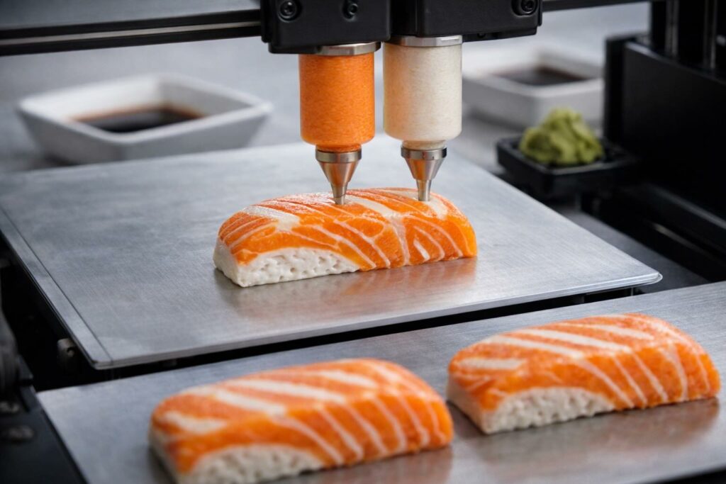 Nel panorama delle alternative ittiche stampate in 3D, esistono già casi di prodotti ispirati al salmone, presentati come passaggio verso una produzione più scalabile di cibi stampati. Il brevetto discusso qui, però, spinge su un terreno diverso: l’idea di imitare la resa estetica del crudo (sashimi), dove colore, venature e “lucidità” sono parte della percezione, non solo la forma esterna.