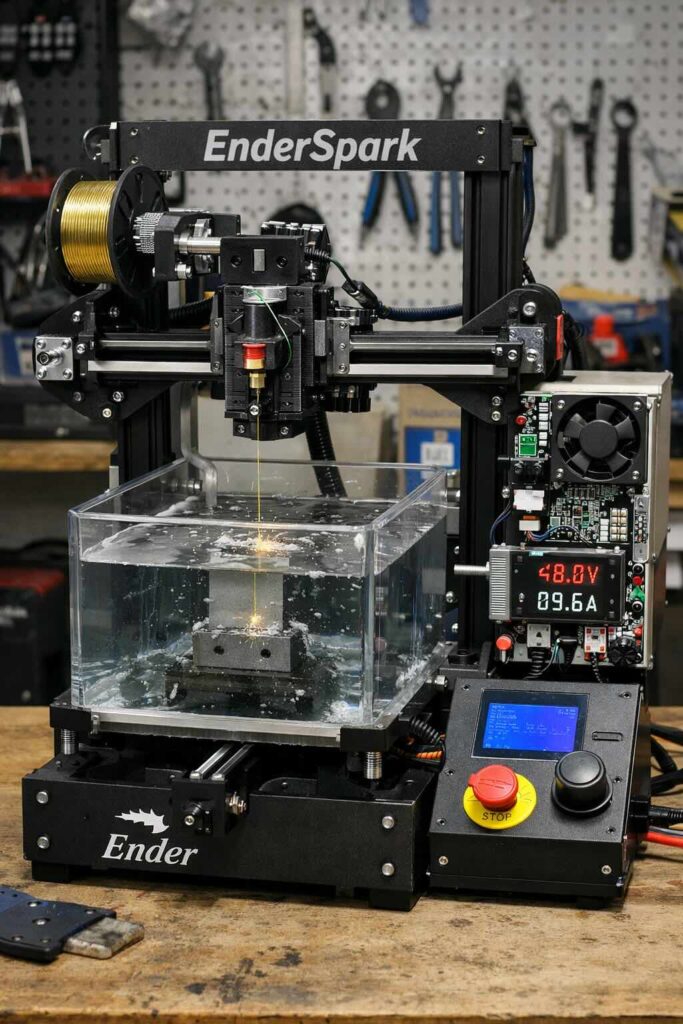 EnderSpark è un progetto DIY che riutilizza la meccanica di una stampante 3D Creality Ender-3 non più funzionante come piattaforma di posizionamento XY per una piccola macchina Wire EDM (WEDM): invece di rimuovere materiale con una fresa (forze meccaniche), la lavorazione avviene tramite micro-scariche elettriche tra un filo metallico e un pezzo conduttivo, che erodono progressivamente il materiale. L’idea centrale è semplice: una Ender-3 ha già un sistema di movimento economico, diffuso e riparabile; sostituendo “stampa” con “taglio per elettroerosione”, si ottiene una macchina capace di tagliare metalli conduttivi anche difficili da lavorare con metodi tradizionali, mantenendo un budget tipico del mondo maker.