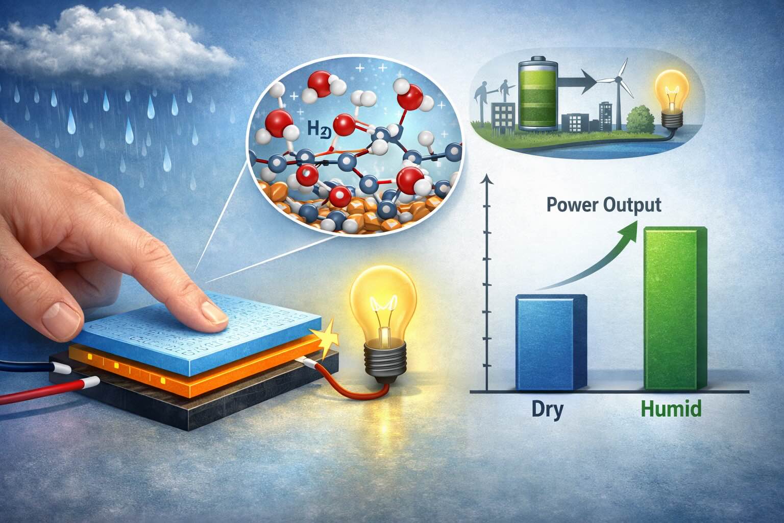 Gli autori mettono a confronto il nuovo sistema con un precedente TENG tollerante all’umidità basato su un composito di cloruro di litio e MXene (Ti3C2Tx) disperso in polivinilalcol (PVA), anche questo progettato per operare in ambiente umido. Pur in assenza di filler inorganici e sali igroscopici, il dispositivo UNSW registra una densità di potenza circa doppia rispetto al TENG LiCl/MXene/PVA riportato in letteratura. Questo mette in evidenza il ruolo chiave della progettazione della rete polimerica e dei domini d’acqua confinati, più che dell’aggiunta di componenti altamente igroscopici o fortemente conduttivi.