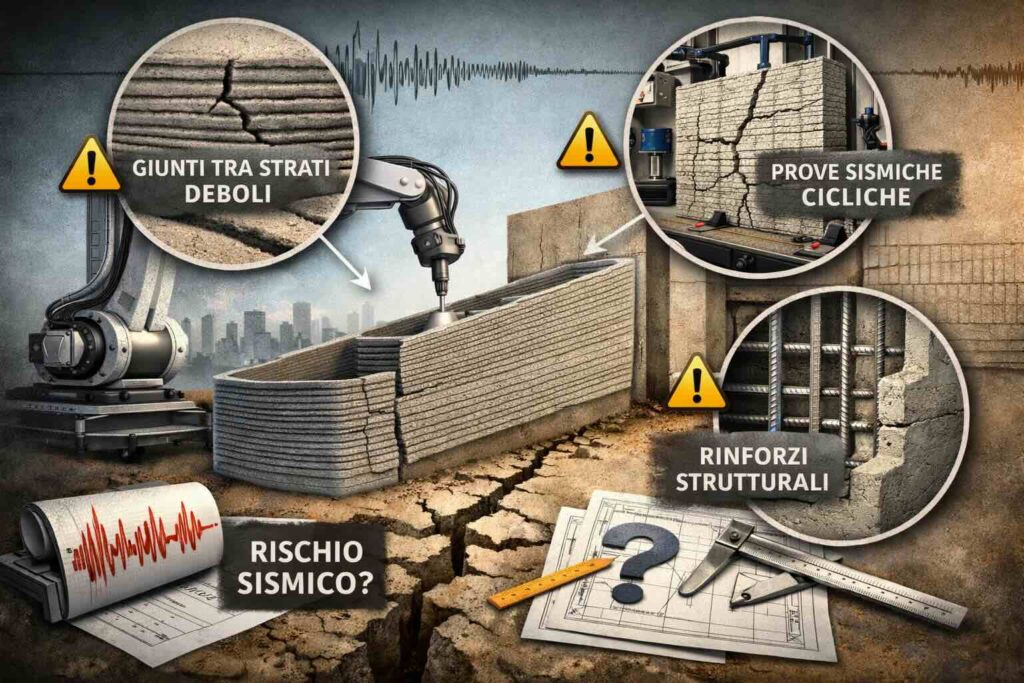 La stampa 3D del calcestruzzo (spesso indicata come 3DCP, 3D Concrete Printing) sta entrando in progetti reali grazie a vantaggi pratici: geometrie senza casseri, automazione del deposito, possibilità di ridurre materiale dove non serve e integrare funzioni architettoniche nel “percorso di stampa”. Il punto critico è che in zona sismica i requisiti non riguardano solo la resistenza a compressione, ma soprattutto duttilità, capacità dissipativa, degrado di rigidezza e comportamento ciclico ripetuto, cioè esattamente le aree in cui la stratificazione può introdurre debolezze e variabilità.