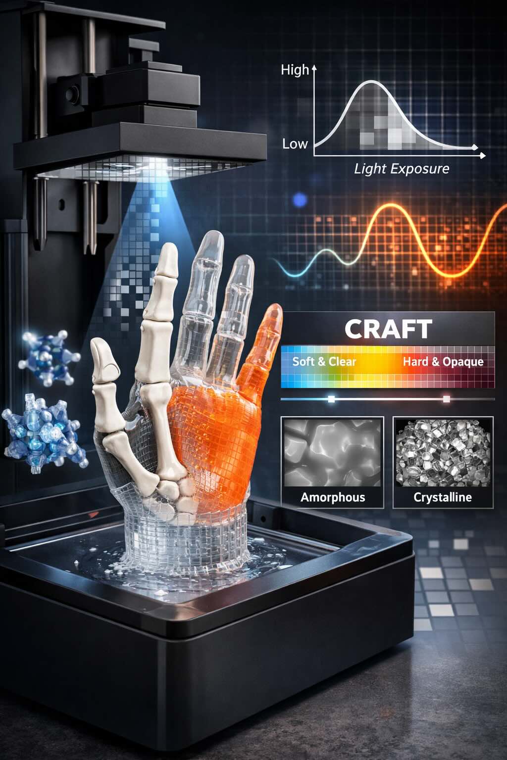 Nella manifattura additiva, ottenere proprietà diverse nello stesso componente (ad esempio una parte rigida accanto a una parte flessibile, oppure zone trasparenti vicino a zone opache) richiede spesso più materiali, cambi di cartuccia, post-processi o strutture assemblate. Il metodo CRAFT (Crystallinity Regulation in Additive Fabrication of Thermoplastics) nasce per affrontare proprio questo limite: creare, in un’unica stampa e partendo da un solo “feedstock”, regioni con comportamento meccanico e ottico differente, controllate localmente a scala di pixel tramite la dose di luce.