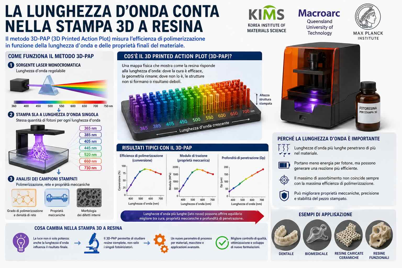Nei processi di stampa 3D basati sulla luce, come SLA, DLP e MSLA, la qualità di un pezzo non dipende soltanto dalla quantità di energia inviata alla resina. Un gruppo di ricerca ha proposto un metodo per misurare in modo più sistematico quali lunghezze d’onda permettono a una fotoresina di polimerizzare con maggiore efficacia, e con quali effetti sulle proprietà finali del materiale. Il metodo si chiama 3D Printed Action Plot, o 3D-PAP, e trasferisce nella stampa 3D un concetto già usato nella fototchimica: il grafico di azione fotochimica.