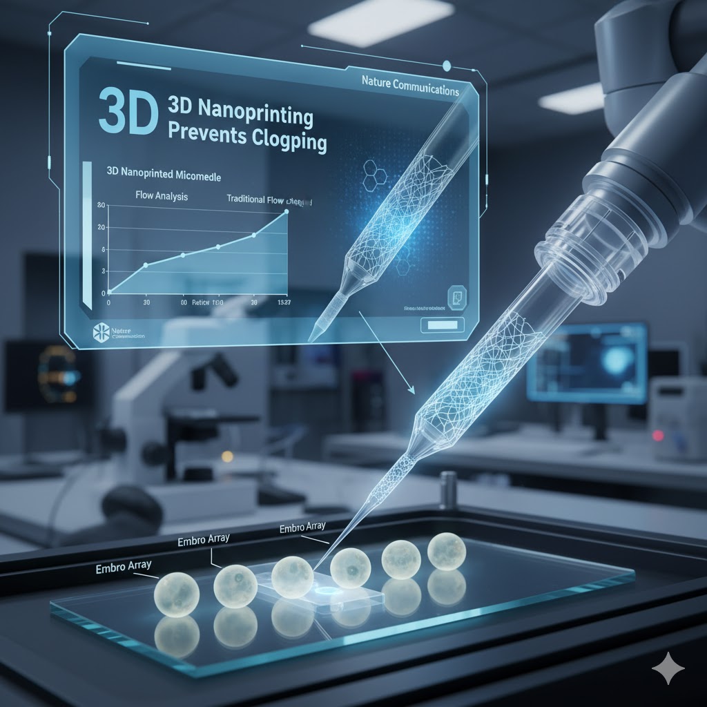Un team dell’Università del Maryland ha progettato e stampato con Two-Photon Direct Laser Writing (DLW) microneedle cave alte 650 µm con punta piena, 20 porte laterali da ~5 µm e microfiltro interno (pore ~3,25–3,5 µm). In prove su embrioni di zebrafish, queste geometrie hanno azzerato i casi di occlusione completa rispetto ad aghi di vetro standard e ad aghi di controllo stampati con singola apertura in punta. Lo studio è stato pubblicato l’11 settembre 2025 su Microsystems & Nanoengineering (Nature Portfolio).