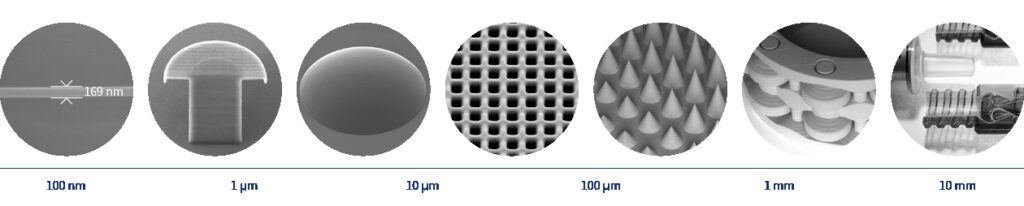 La gamma di dimensioni accessibili con NanoOne va da strutture inferiori a 150 nanometri fino a oggetti più grandi di 40 millimetri di altezza. Questa estensione di scala è resa possibile dall’impiego di quattro lenti con risoluzioni differenti, selezionabili a seconda del compromesso desiderato tra dettaglio e volume di stampa.