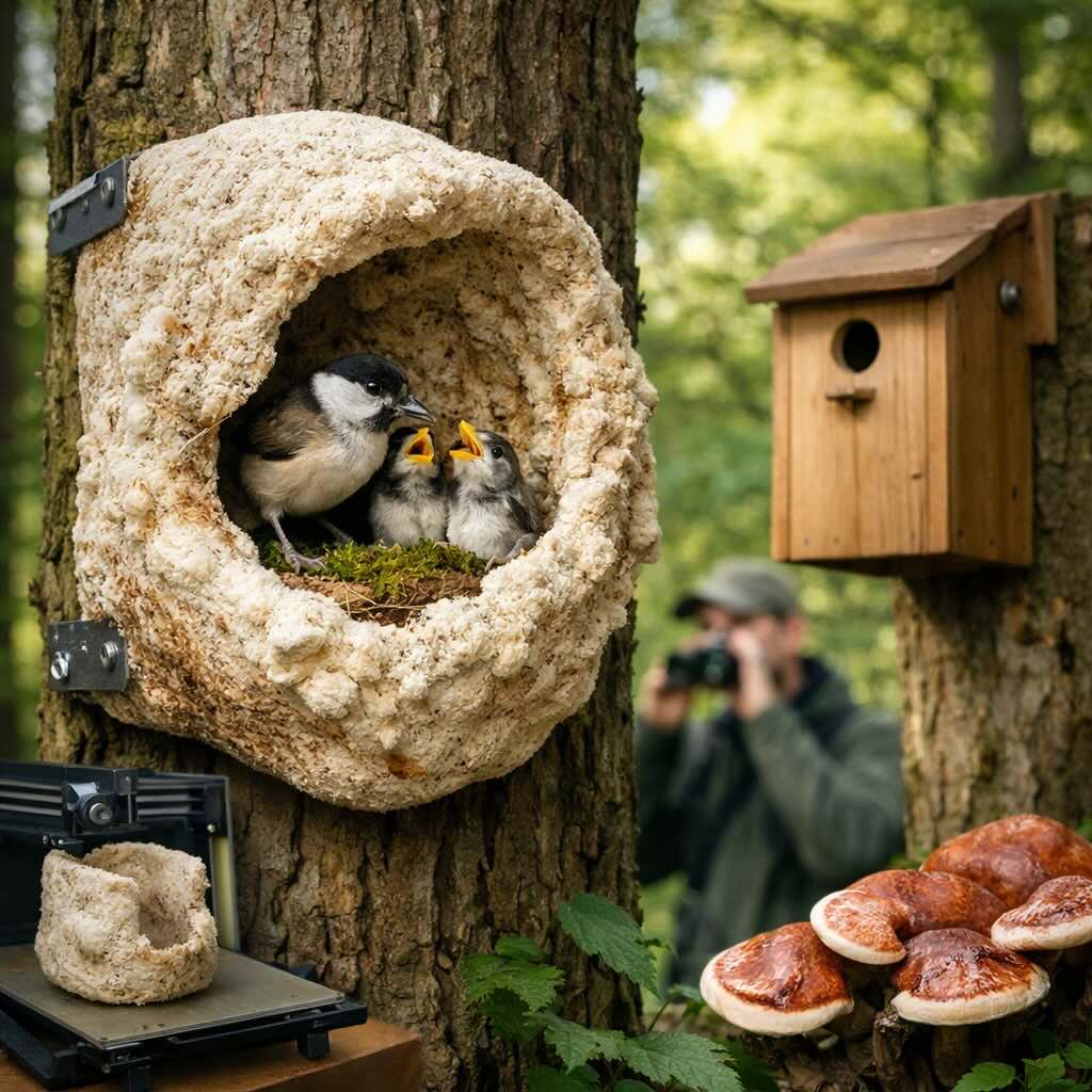 La struttura di base viene stampata in 3D usando una miscela di segatura e plastica biodegradabile di origine vegetale. Su questa base viene poi fatto crescere il micelio del fungo reishi, scelto perché disponibile nell’area e adatto a creare una superficie irregolare che ricorda le pareti interne delle cavità naturali. L’obiettivo non è soltanto ridurre l’uso di materiali convenzionali, ma ottenere una cavità con proprietà più vicine a quelle di un albero: isolamento, leggerezza, capacità di dissipare meglio gli sbalzi ambientali e una forma meno standardizzata rispetto alle classiche cassette-nido.