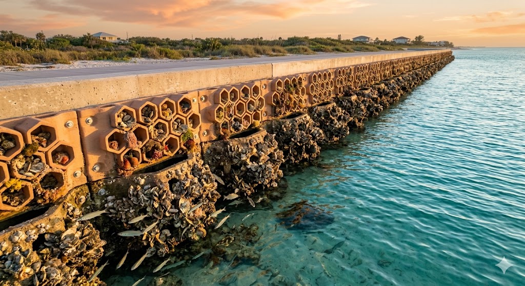 Le ostriche che colonizzano le strutture ORBS svolgono un ruolo chiave per la qualità delle acque di Tampa Bay: ogni individuo adulto può filtrare grandi volumi d’acqua al giorno, contribuendo a ridurre torbidità, nutrienti in eccesso e particolato sospeso. Col tempo, la crescita delle conchiglie e la deposizione di sedimento trasformano i mattoni in argilla in veri micro-reef, capaci di offrire riparo e substrato per alghe, crostacei, piccoli pesci e altre specie, incrementando la biodiversità locale. Interventi di questo tipo si affiancano ad altri progetti internazionali di “living seawall” e reef stampati in 3D, che utilizzano geometrie complesse e materiali compatibili con l’ambiente marino per rendere più funzionali dal punto di vista ecologico le infrastrutture costiere esistenti.
