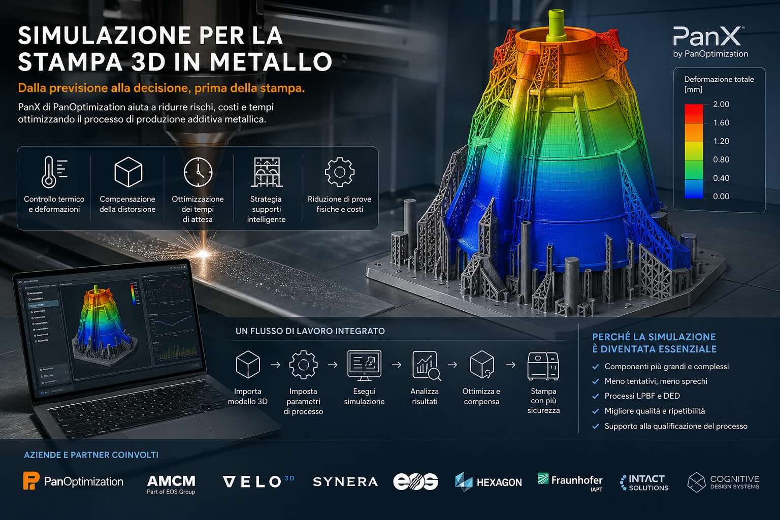 PanOptimization propone PanX come piattaforma di simulazione e ottimizzazione per la produzione additiva metallica. Il software è basato su analisi agli elementi finiti e punta a gestire processi LPBF e DED, con attenzione a componenti di grande scala e geometrie complesse. Metal AM Magazine indica che PanX è pensato per simulare e ottimizzare laser powder bed fusion e directed energy deposition, con funzioni che includono parametri, timing di processo e compensazione della distorsione.