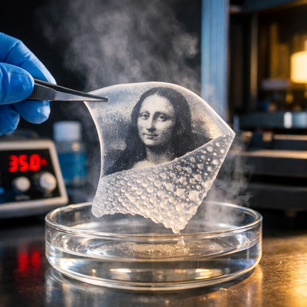 Per mostrare la risoluzione e la leggibilità della codifica, il gruppo ha scelto un’immagine nota (la Mona Lisa) trasformandola in pattern halftone stampabile. Il punto non è il soggetto, ma la logica: lo stesso film può comportarsi come supporto di memoria in cui l’immagine resta invisibile finché non viene applicato lo stimolo corretto (temperatura o solvente), rendendo l’oggetto una sorta di “cifrario fisico” basato su proprietà del materiale anziché su elettronica.