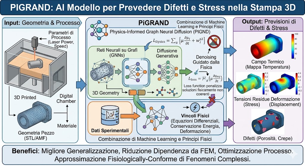 PiGRAND è un modello di intelligenza artificiale basato su Physics informed Graph Neural Diffusion pensato per portare la simulazione e l’ottimizzazione di processi di additive manufacturing a un livello più aderente alla fisica reale. L’approccio combina reti neurali su grafi, modelli di diffusione generativa e vincoli fisici espliciti per prevedere in modo coerente stati termici, deformazioni e difetti in componenti stampati in 3D, riducendo la dipendenza da sole simulazioni FEM tradizionali o da modelli puramente statistici.