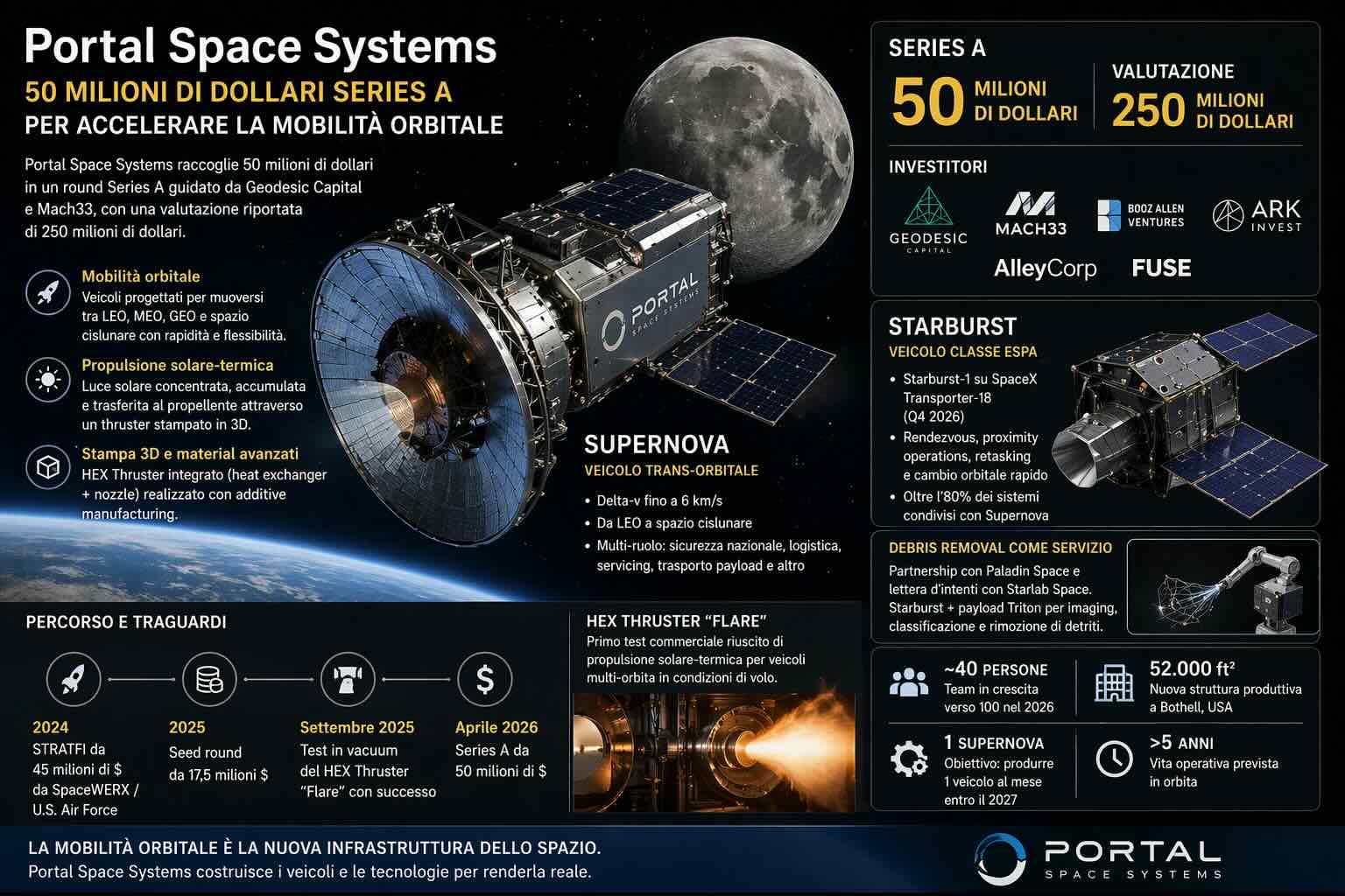 Prima del Series A, Portal aveva già annunciato un seed round da 17,5 milioni di dollari nel 2025 e, ancora prima, un STRATFI da 45 milioni di dollari assegnato tramite l’ecosistema SpaceWERX / U.S. Air Force per sostenere lo sviluppo di Supernova. Questo è un dettaglio importante perché colloca Portal in una fascia di aziende che non vivono solo di narrativa da startup, ma si muovono in un’area dove investitori privati, mercato defense e programmi pubblici convergono sul tema della mobilità orbitale. La partecipazione di Geodesic Capital, Mach33, Booz Allen Ventures, ARK Invest, AlleyCorp e FUSE rafforza questo quadro.