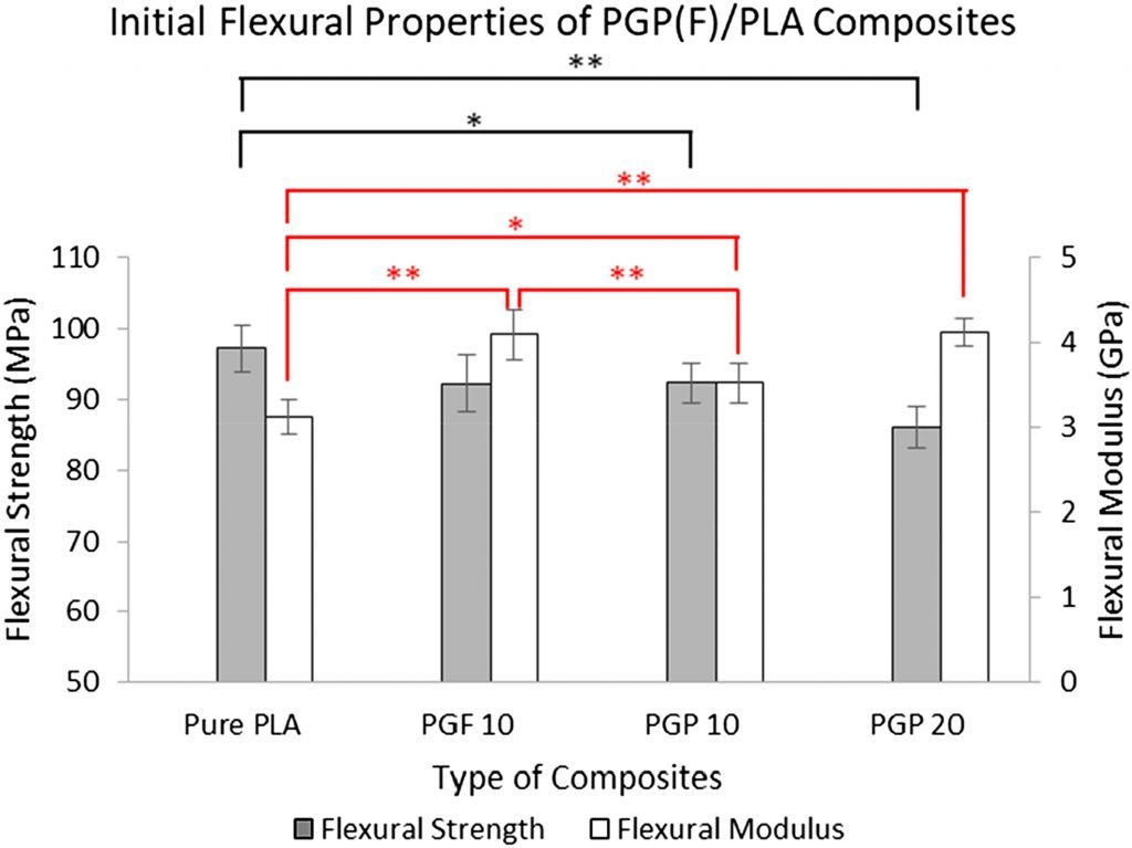 I compositi continui PGF / PLA sono più “adatti”, secondo gli autori, per quanto riguarda la fissazione portante, una caratteristica connessa con fibre continue che portano alla rigidità. Il modulo di flessione di questi materiali, tuttavia, è stato ridotto di circa l’80% dopo 28 giorni di degradazione. I compositi PGF 10 hanno perso ~ 30% del modulo di flessione iniziale dopo un periodo di degradazione di 56 giorni. Il rapido modulo di flessione avrebbe potuto essere il risultato del fatto che le estremità delle fibre fossero esposte nei mezzi di degradazione.