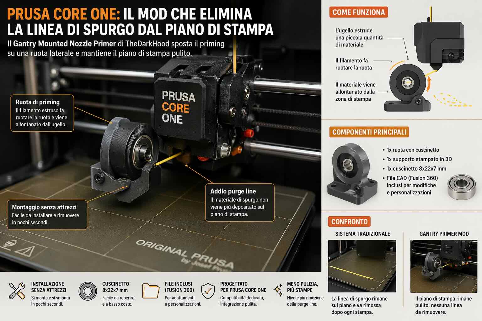 Prima di iniziare un lavoro, molte stampanti FFF depositano una prime line sul bordo del piano per ristabilire un flusso regolare del materiale e preparare il primo layer. Il problema è pratico: quella striscia resta spesso sul piatto e si accumula tra una stampa e l’altra. Da qui nasce l’idea del maker TheDarkHood, che ha presentato un accessorio chiamato Gantry Mounted Nozzle Primer per Prusa CORE One, pensato per spostare la fase di priming fuori dal piano di stampa e ridurre la pulizia manuale a fine lavoro.