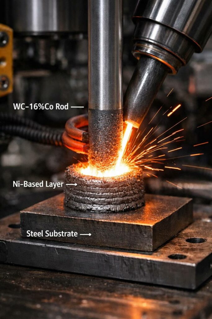 Nel lavoro scientifico, il team usa barre sinterizzate di carburo cementato WC–16%Co come materiale di base per la deposizione. Il punto tecnico è che le proprietà peggiorano quando compaiono porosità e fasi/composti legati alla decomposizione del WC, tra cui la formazione di W₂C (indicata come una delle cause di deterioramento). L’obiettivo sperimentale è quindi costruire un corpo in WC–Co evitando sia difetti macroscopici sia trasformazioni microstrutturali che abbassano la durezza.