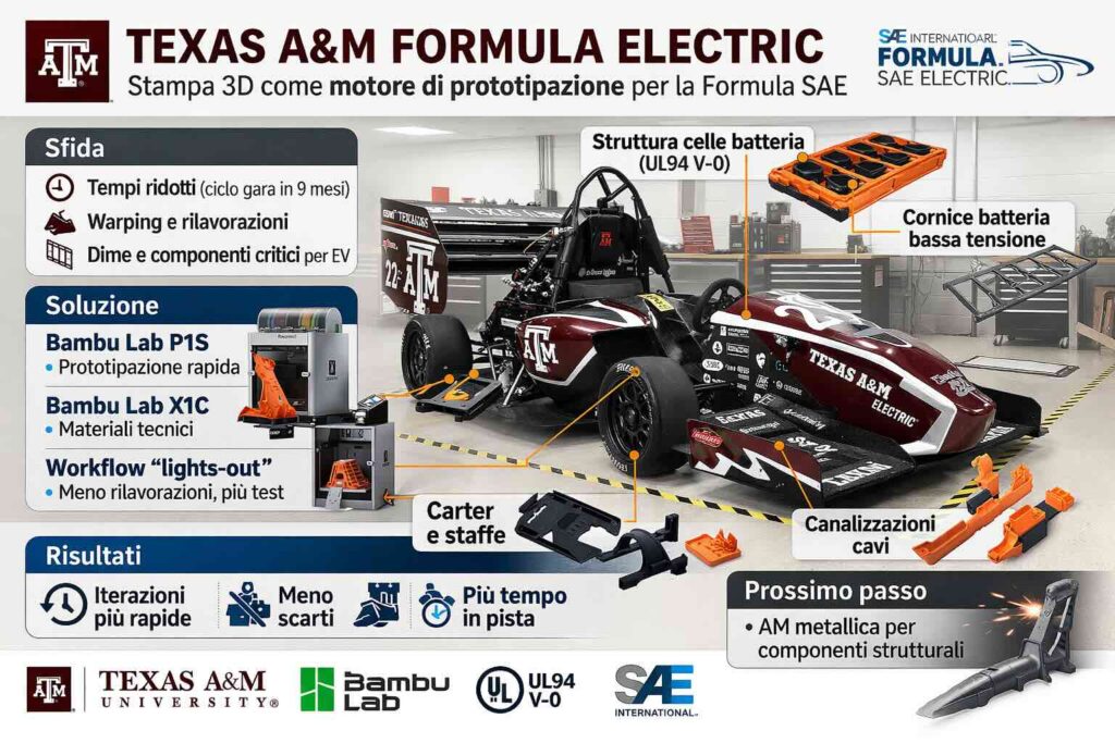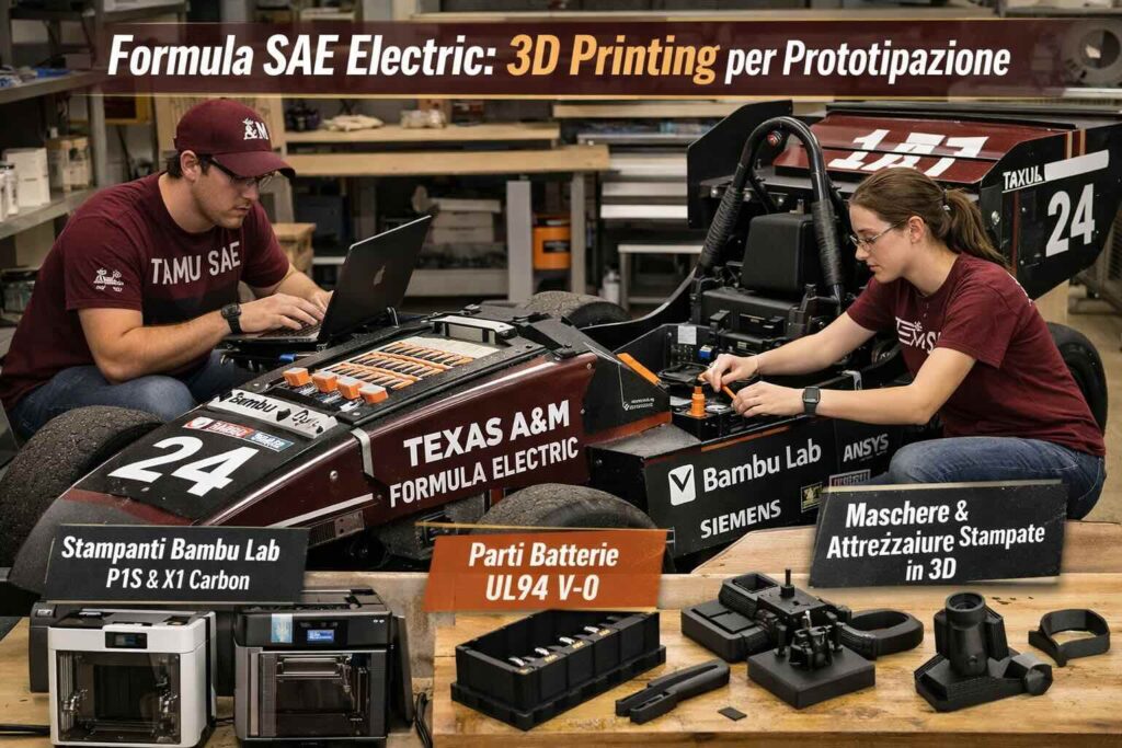 Oltre alla stampa nel laboratorio del team, Texas A&M descrive anche strutture universitarie (come un prototyping center) che includono stampanti e specifiche di macchina/materiali disponibili. In un ecosistema così, un team Formula SAE può scegliere se produrre internamente ciò che serve “oggi” e appoggiarsi a infrastrutture condivise per materiali o macchine diverse, bilanciando tempi, costi e vincoli di progetto.