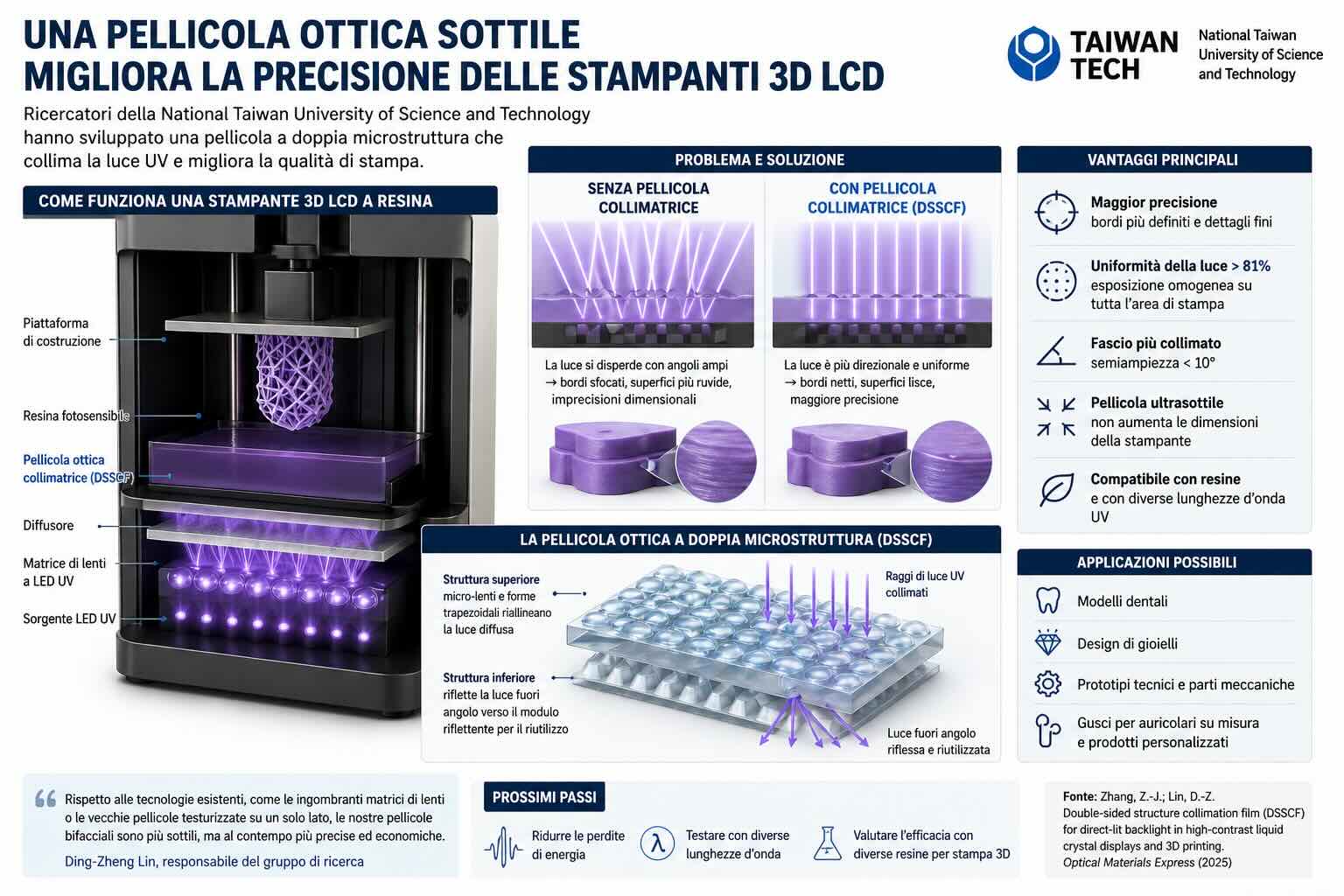 Un gruppo di ricerca della National Taiwan University of Science and Technology ha sviluppato una pellicola ottica ultrasottile pensata per migliorare il modo in cui la luce viene distribuita all’interno delle stampanti 3D a resina basate su tecnologia LCD. Il lavoro è stato descritto sulla rivista Optical Materials Express, pubblicata da Optica Publishing Group, con il titolo Double-sided structure collimation film (DSSCF) for direct-lit backlight in high-contrast liquid crystal displays and 3D printing. Gli autori indicati sono Zi-Jain Zhang e Ding-Zheng Lin.