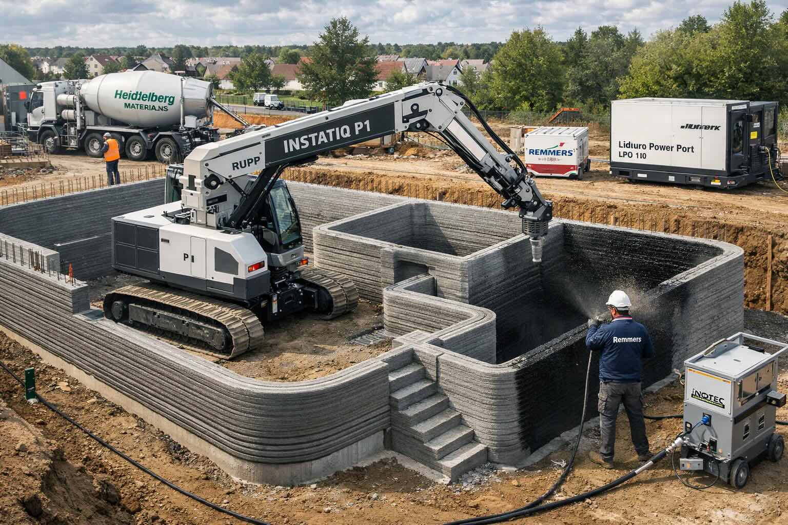 Un cantiere a Weißenhorn (Baviera, Germania) sta diventando un caso di studio per la stampa 3D in calcestruzzo applicata a elementi strutturali più complessi di una semplice parete fuori terra: qui è in corso la realizzazione di quello che viene descritto come il primo seminterrato (keller) stampato in 3D al mondo con un sistema mobile, montato e operativo direttamente sul lotto di costruzione. L’iniziativa è impostata come progetto pilota industriale e mette insieme competenze diverse: Rupp Gebäudedruck (impresa esecutrice e specialista in edilizia stampata), INSTATIQ (tecnologia di stampa e robotica), Heidelberg Materials (calcestruzzo per stampa 3D), Remmers (impermeabilizzazione), INOTEC (macchine e pompaggio per l’applicazione della guaina) e Liebherr (fornitura energetica mobile).