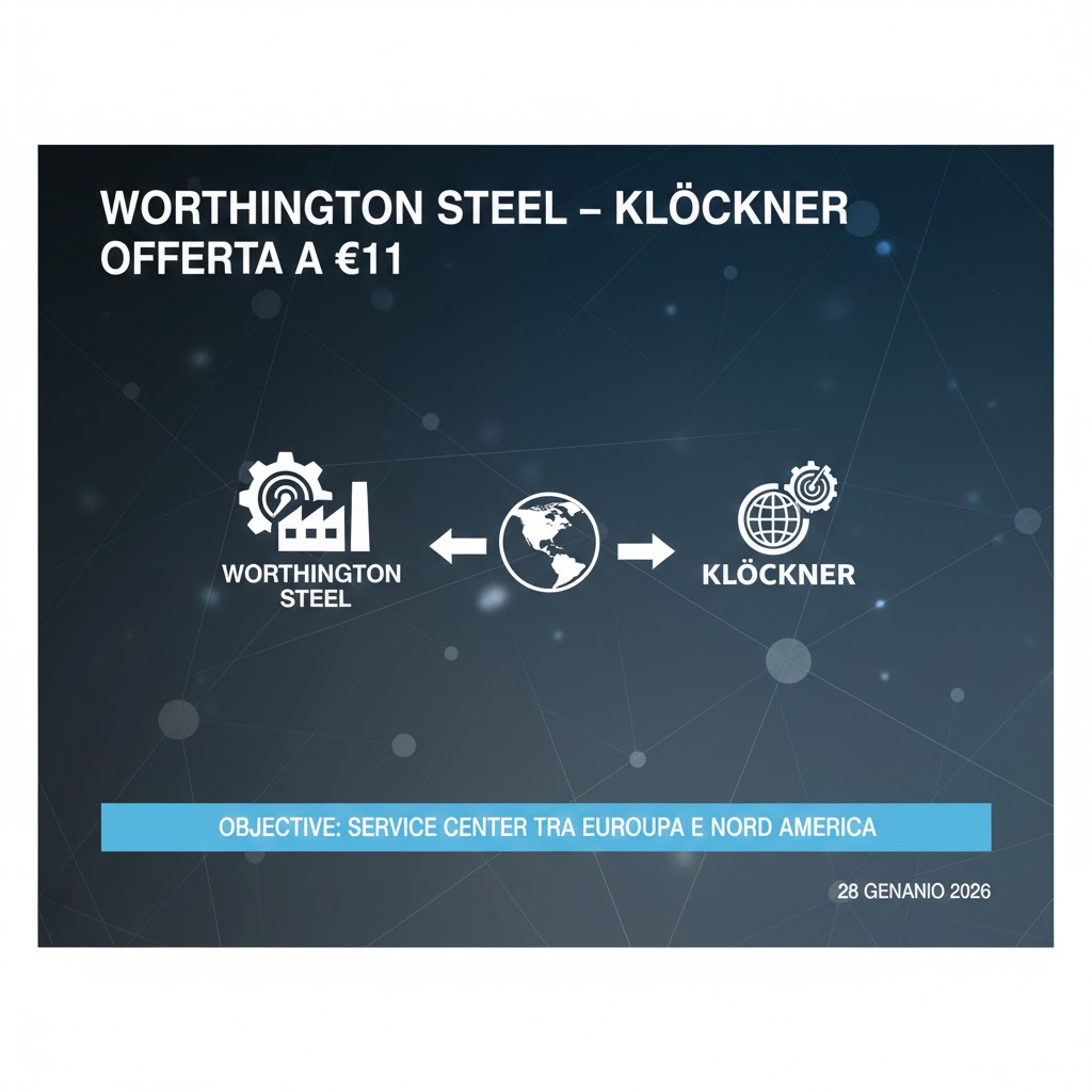 Il 15 gennaio 2026 Klöckner & Co e Worthington Steel comunicano di aver firmato un business combination agreement dopo il completamento della due diligence e delle negoziazioni. Nella stessa comunicazione viene indicato un prezzo d’offerta di €11,00 per azione Klöckner, con un premio dichiarato di circa +81% rispetto alla chiusura del 5 dicembre 2025 e di circa +98% rispetto al VWAP “non disturbato” a tre mesi fino al 5 dicembre 2025; l’enterprise value implicito viene indicato in circa €2,1 miliardi (USD 2,4 miliardi). La documentazione spiega anche che l’offerta sarebbe soggetta a condizioni tipiche, incluse autorizzazioni regolatorie, con soglia minima di adesione indicata al 65%.