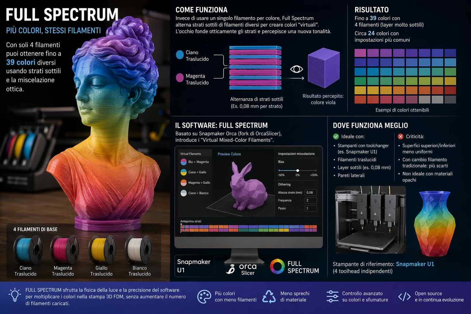 Dal punto di vista software, Full Spectrum è presentato come un fork open source di Snapmaker Orca, a sua volta derivato da OrcaSlicer. Nel repository GitHub del progetto si legge che il fork è ottimizzato per la Snapmaker U1 e introduce il supporto ai virtual mixed-color filaments, cioè filamenti virtuali che non esistono fisicamente come bobine autonome ma vengono simulati alternando gli strati di due o più filamenti reali. La documentazione del progetto descrive anche funzioni dedicate alla generazione automatica delle combinazioni cromatiche, alla visualizzazione in anteprima del colore risultante e all’assegnazione dei filamenti misti agli oggetti come se fossero materiali normali.